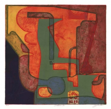 Ross joined the faculty of Manhattanville College in 1964 where he taught studio art until 1986. He designed the BFA program, and served as chair of the art department from 1966 to 1972. The United States Information Agency selected him to be an artist in residence in Eastern Europe, where he taught printmaking in Yugoslavia and Romania. It was during this time that he helped develop the collagraph technique, in part serendipitously. He was getting copper plates for etching from Vienna, when the supply ran out. Ross and Romano devised a process of gluing together textures on a cardboard backboard and printing on an etching press – a kind of printed collage--a process for which they would become famous. He embraced the process, as he enjoyed the freedom of the variety of the textures and the creative ability to arrange them at will. The term “collagraph” comes from the Greek word “koll” or “kola” which means glue, and “graph,” indicating the activity of drawing. The way John applied the process he combined intaglio and relief, wiping ink into the plate like intaglio, then rolling color ink like relief. The two were instrumental in developing the collagraph as a print medium: Ross taught it at Manhattanville College and The New School, and Romano taught it at Pratt.