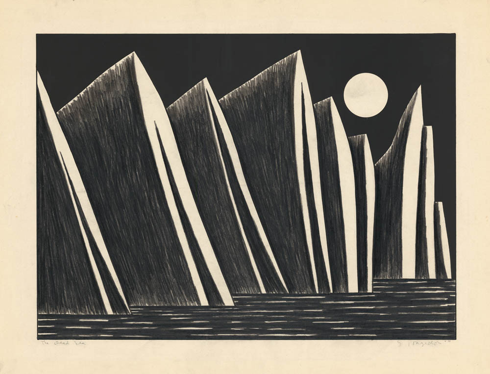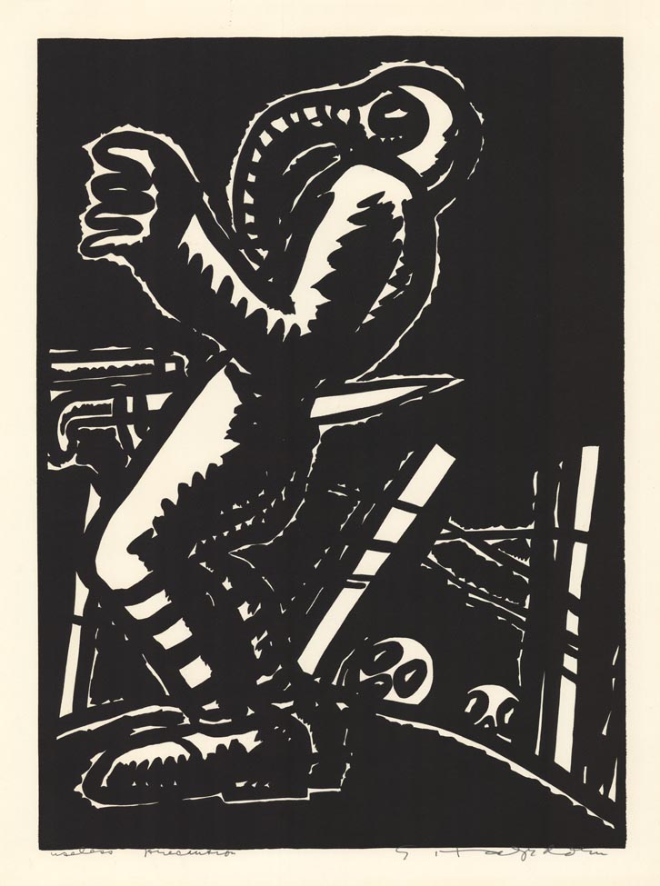 Edward Hagedorn (1902-1982) was born in Berkeley, California and spent most of his life in San Francisco. He studied briefly at the San Francisco School of Fine Arts and was a member of the Society of American Etchers. During the Great Depression he worked with the San Francisco area WPA producing a number of remarkable etchings, drypoints and metal relief prints. Most of these images are dark symbolism against the coming of WWII. His images of this period are strong and effective antiwar images. He experimented with printmaking, sometimes printing the image as an etching or drypoint and others inking the plate as a relief image and printing it that way.