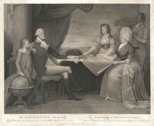 The Washington Family : George Washington, his Lady, and her two Grandchildren by the name of Custis. [Title repeated in French on right].
