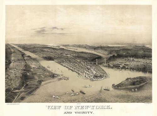 John Bachmann (1814–1896) German-speaking Swiss born printmaker, arrived in New York in 1848. He brought with him a fully developed artistic and printing skills, as his earliest works display a high level of competence and command of the medium of lithography. “Bachmann had produced a number of low-altitude views in Paris and Switzerland, including images of the Place de la Concorde and steeple views of Swiss towns in the early 1840s. Bachmann’s prints exemplify an American reinterpretation of the European bird’s-eye view at a moment when American cities, particularly New York, were defining their modern civic identity. In their pastoralism, early nineteenth-century American pictorial views, made primarily in aquatint, served to distance their viewers from the industrialized city and its dangers. Lithographic bird’s-eye views, which emerged in the 1840s, instead celebrated the evolving industrial city and its modern features… Bachmann’s prints graphically depict the evolving visual language, which operates in tandem with the dramatic changes made to the city’s landscape in just two decades. By mid-century, urban city views became the most popular commercially produced type of lithograph, appearing as household decorations or used—as was more likely with Bachmann’s views—for public display in municipal settings, serving decision makers and civic boosters as advertisements of the wonders of urban life. John Bachmann’s prints illustrate an artistic effort to visualize the increasingly unknowable city of New York, which required him to invent new forms of visual argument at a time when the bounded commercial antebellum city was becoming the sprawling metropolis of the postbellum United States.” Hannah Kinney Bachmann concentrated his attention to a few large cities, primarily New York, Philadelphia and Boston. Reps records a total of fifty three printed views being produced. Taken together his work offers a rich example of lithographic view making during the third quarter of the 19th century.