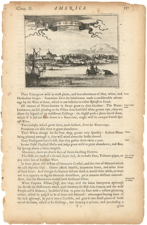 One of the most colorful characters of his day, John Ogilby began his career as a masquerade dancer in Charles I’s Court. An unfortunate injury forced him to retire from the stage, but he went on to make a living as a dance master and theatre manager in London. Having narrowly survived a shipwreck, Ogilby established himself as a publisher of the classics. He conducted a lucrative trade until his business was consumed by the Great Fire of London in 1666, leaving him penniless and destitute. At the grand age of seventy, Ogilby established himself as a mapmaker and publisher, and within a few years had published large volumes on America, Africa, China, Japan, and Asia. Like his America, these works were translations of Montanus’ texts published by Jacob Van Meurs in Amsterdam, and included maps and views copied from earlier sources. Considered one of the most important English cartographers of the seventeenth century, Ogilby became known as the inventor of the strip map and produced the first road maps of England and Wales.