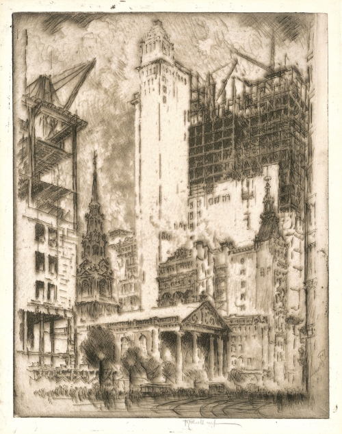 Pennell traveled to Europe in 1881 to illustrate some of the Italian writings of W.D. Howells. While in Europe, Pennell was commissioned by Philip Gilbert Hamerton to illustrate a book about the Saone River. This commission brought him fame and soon he was collaborating with Henry James, Justin McCarthy, and Sir Walter Besant, illustrating the buildings and streets of London. Pennell completed over 1800 etchings and lithographs, executed mostly in Europe before 1917. He destroyed nearly all of his early plates to prevent worn-out re-prints from finding their way onto the market.