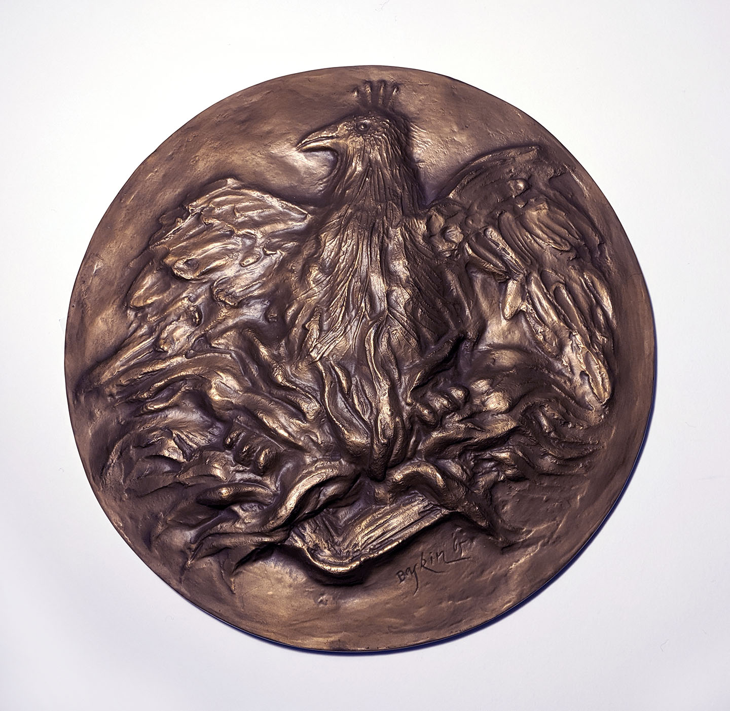 A highly known draftsman, printmaker and sculptor, Leonard Baskin had the ability to depict, in an abstract style, man and his relation to the world. Whether working with bronze, wood or two-dimensional mediums, his focus remained on large heroic but flawed human beings who, at times, recall photographic images of concentration-camp victims or birds with human bodies that suggest mythological forms.