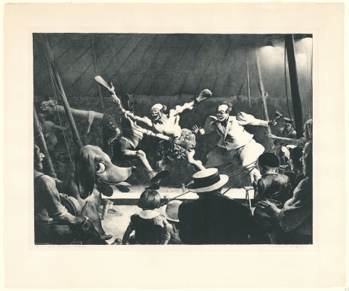 "Robert Riggs's dream at age eleven was to join the traveling carnival troupes that he saw in Decatur and picture in a hundred or so drawings that reveal his precocious talent. After studies at the Art Students League in New York from 1915-1917, he worked as an illustrator for the Philadelphia advertising agency N.W. Ayer and Son. In 1918 he spent time in Paris, where he took courses at the Academie Julian. He produced his first lithograph in 1932, on themes from the popular world of boxing ("Before the Fight", 1932). When Ringling Brothers came to Philadelphia the following year he made a systematic study of the circus. During the day he sketched and photographed the performers outside the ring, and in the evening he attended their performances. From this close contact came a series of fifteen meticulously realistic lithographs depicting the top-billed acts of the the three-ring show: the clown Felix Adler, the Flying Concellos, the barebacked-riding Reiffenach sisters, the high-wire walker Con Colleano, the elephant trainer Larry Davis, and the Wein Hais Chinese acrobats. In 1934 national acclaim from the technical virtuosity of his lithograph "Center Ring" prompted him to give up painting and devote himself to drawing and printmaking." - "The Great Parade : Portrait of the Artist as Clown" edited by Jean Clair, Published by Yale University Press, 2004.