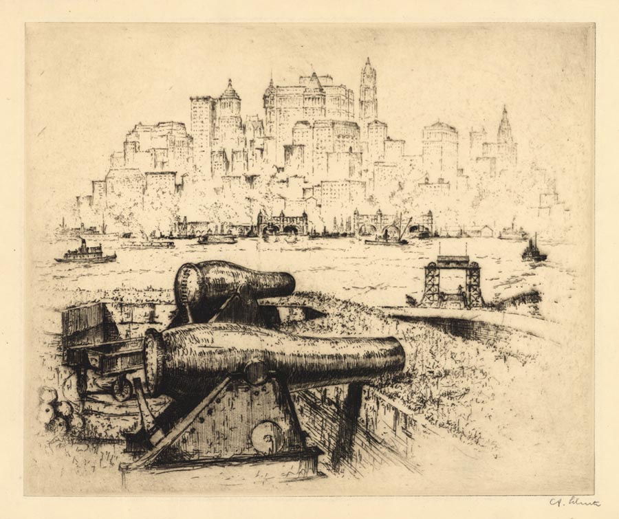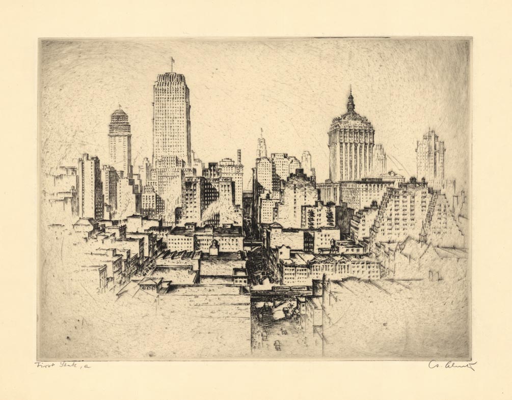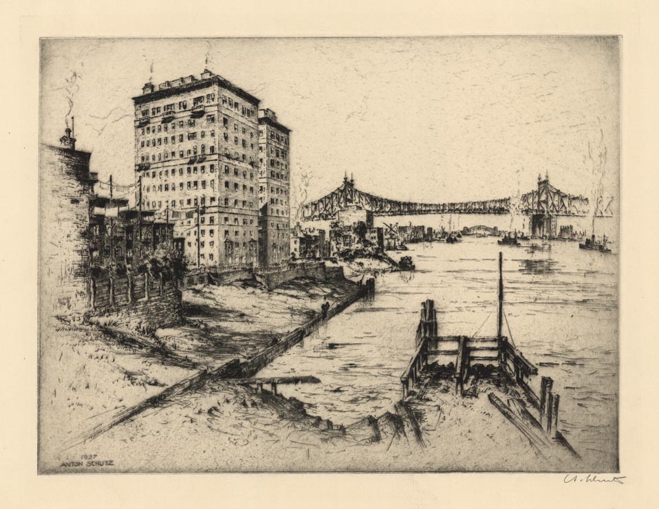 Anton Schutz was a German-American artist, born in Berndorf, Germany in 1894. He is best known for his cityscapes and architectural etchings, especially of New York City. Schutz began his formal studies at the University of Munich, but they were put on hold because of World War I. After serving in the German Army, he returned to the University for a period of time before moving on to the Royal Academy of Fine Art, where he earned his degree in Mechanical Engineering and Architecture in 1920. He immigrated to the United States in 1924, where he met and befriended artist Joseph Pennell in New York City. That same year, he had his first several solo exhibitions at Anderson Gallery.