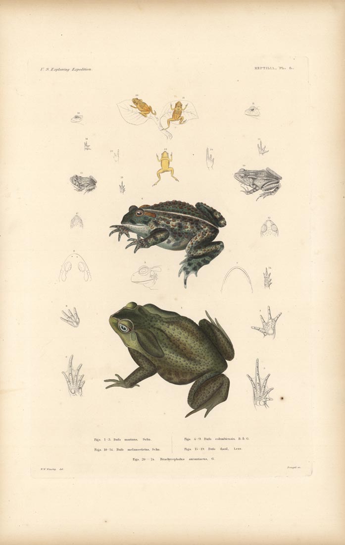 Reptilia, Pl. 5. Figs. 1-3. Bufo marinus. Figs. 4-9. Bufo columbiensis. Figs. 10-14. Bufo melanostictus. Figs. 15-19. Bufo thaul. Figs. 20-24. Brachycephalus aurantiacus.