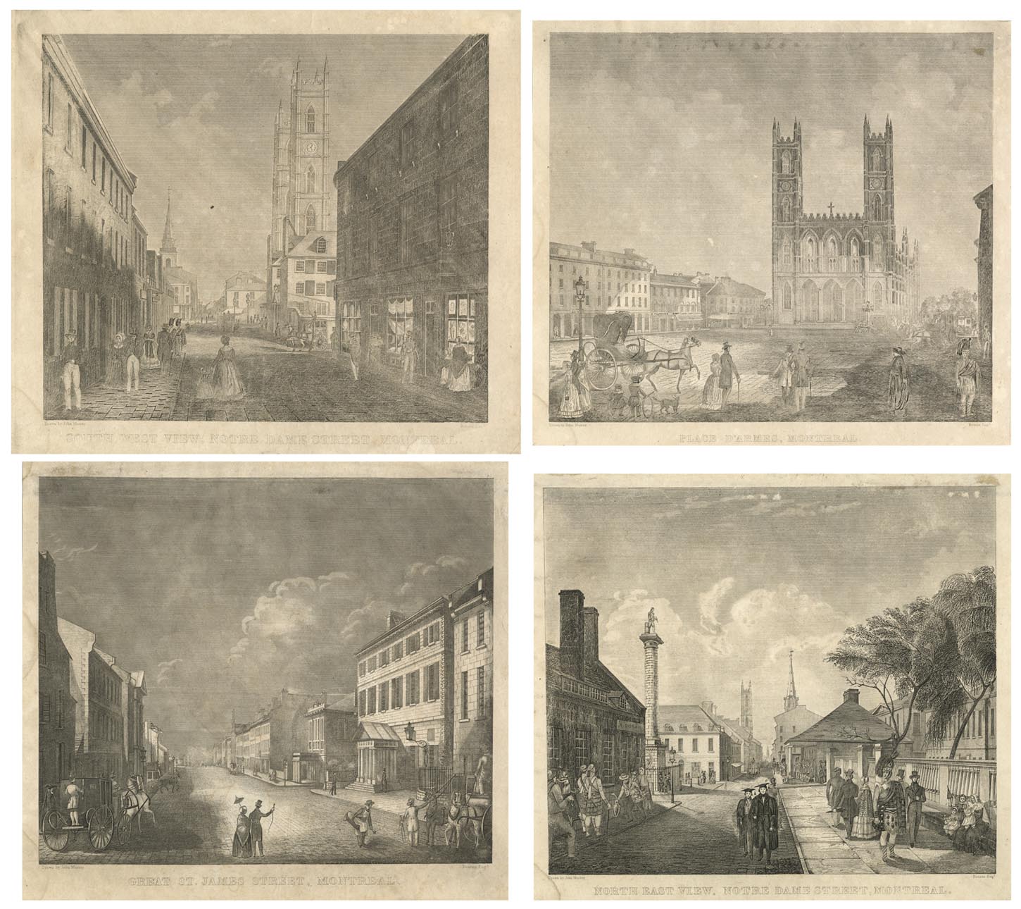 Set 4. Place D'Arnes, Montreal. (and) Great St. James Street, Montreal (and) South West View, Notre Dame Street, Montreal. (and) North West View, Notre Dame Street, Montreal.