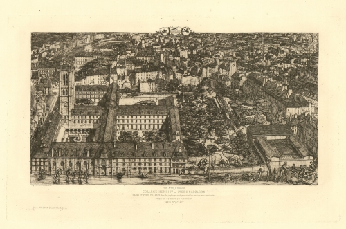 Vue a vol D'oiseau College Henri IV ou Lycee Napoleon. : Grand et petit colleges, avec les jardins qui en dependent et les constructions avoisinantes : Prise du sommet du pantheon.