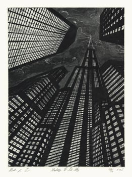 The mystery and grandeur of New York City's environment has inspired a lifetime of work. Di Cerbo uses geometric forms and patterns of light and darkness to allude to the soaring architecture of the urban skyscraper. One can see the city from the perspective of an ant or an eagle, moving endlessly upward or falling away into infinite chasms. The images, though devoid of any overt signs of life, create an ambiance of mystery. One may find themselves alone in his compositions as an observer of a timeless cityscape.