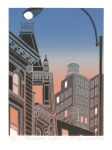 Emily Trueblood makes prints almost exclusively using relief printmaking techniques of linoleum or linocut and woodcut blocks. The artist sketches a composition on a block of linoleum or wood and then cuts away pieces from the surface with a chisel or gouge, leaving a raised area which will receive the ink. A roller is used to apply ink to the raised surface, and the image is transferred to paper with a press or by hand burnishing. Since the recessed cut-away areas do not receive ink, they appear white (paper color) on the printed image. Traditionally, if an artist wants to incorporate multiple colors into the linocut/woodcut, each color will be printed with its own carved block – a more complex system needing a strict method of registration to avoid overlapping or misplacement. Emily has also mastered the rainbow roll – a printmaking technique that makes subtle gradations and color blends.