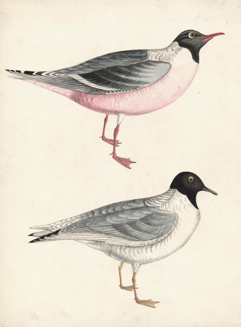 DESCRIPTION: Two gulls portrayed, one with a pink underside and pink legs, the other with a white underside and pale orange legs. Both are in profile. "On "1834" Whatmann watermarked paper."