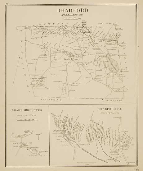 DESCRIPTION: A fine map of the town that appeared in Hurd's "Town and City Atlas of the State of New Hampshire." The map identifies roads, ponds,and homes. Many of the homeowners are identified. The inset in the lower left is of Bradford Center.