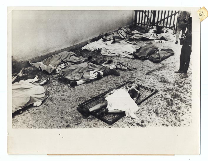 DESCRIPTION: By Wide World Photos. Text sheet attached verso. "Blanket-covered bodies of white hostages slain by rebel Congolese in Stanleyville Nov. 24 lie in courtyard where they were mowed down as Belgian paratroopers dropped on the city in attempt to save them. Body in center with light trousers and dark shirt was identified as American missionary Dr. Paul Carlson of Santa Ana, Calif. 11/26/64."