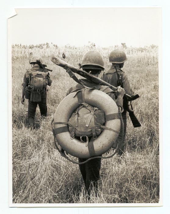 DESCRIPTION: Text sheet attached verso "Duc Hoa, South Viet Nam: Vietnamese infantryman carries a life preserver over his back-pac as he and fellow troopers walk through high grass during an operation in Delta area near her recently. Credit (UPI Radiophoto by Steve Northup) 3/17/66."