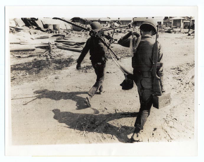 DESCRIPTION: Text sheet attached verso "Thanh Phulong, South Viet Nam: Equipment slung over their shoulders, a Vietnamese machinegun crew moves into Thanh Phulong following a Viet Cong Attack on the village December 26th that left hundreds homeless. Viet Cong troops disregarded the U. S. backed cease-fire and attacked all six districts in Long An province, as well as other points in South Viet Nam. Credit (UPI Radiophoto by Steve Northup) 12/27/65."