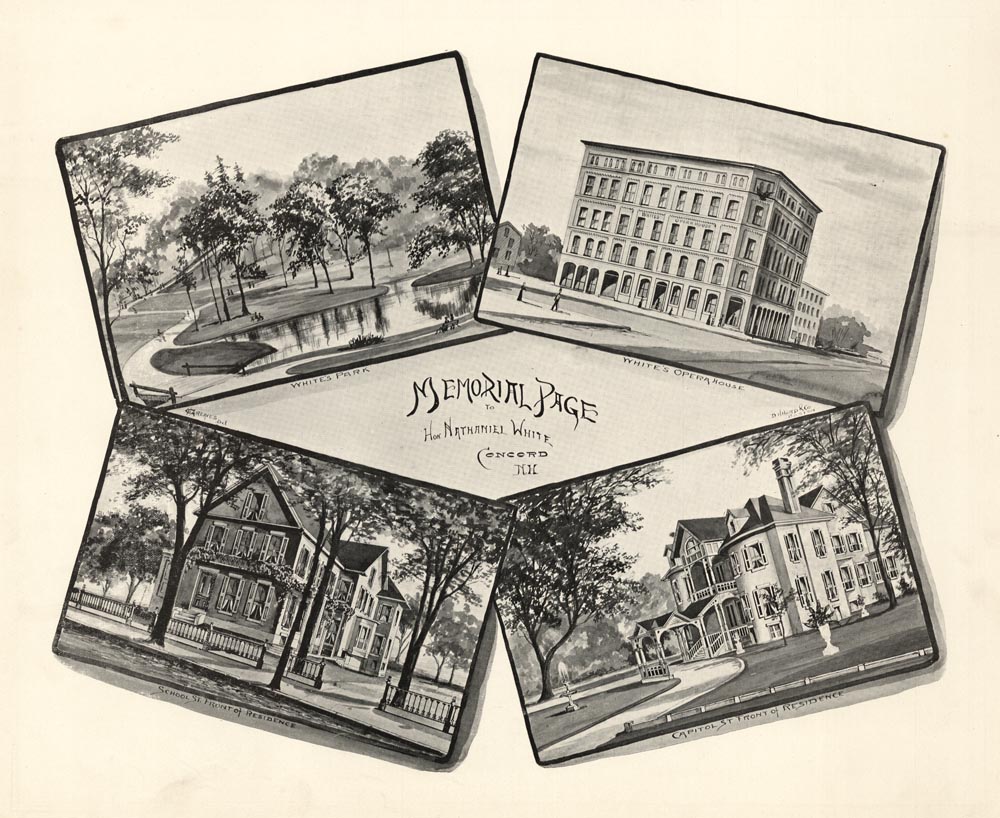 DESCRIPTION: A fine photogravure of the White's Park, White's Opera House, School St. Front of Residence, and Capitol St. Front of Residence that appeared in Hurd's "Town and City Atlas of the State of New Hampshire."