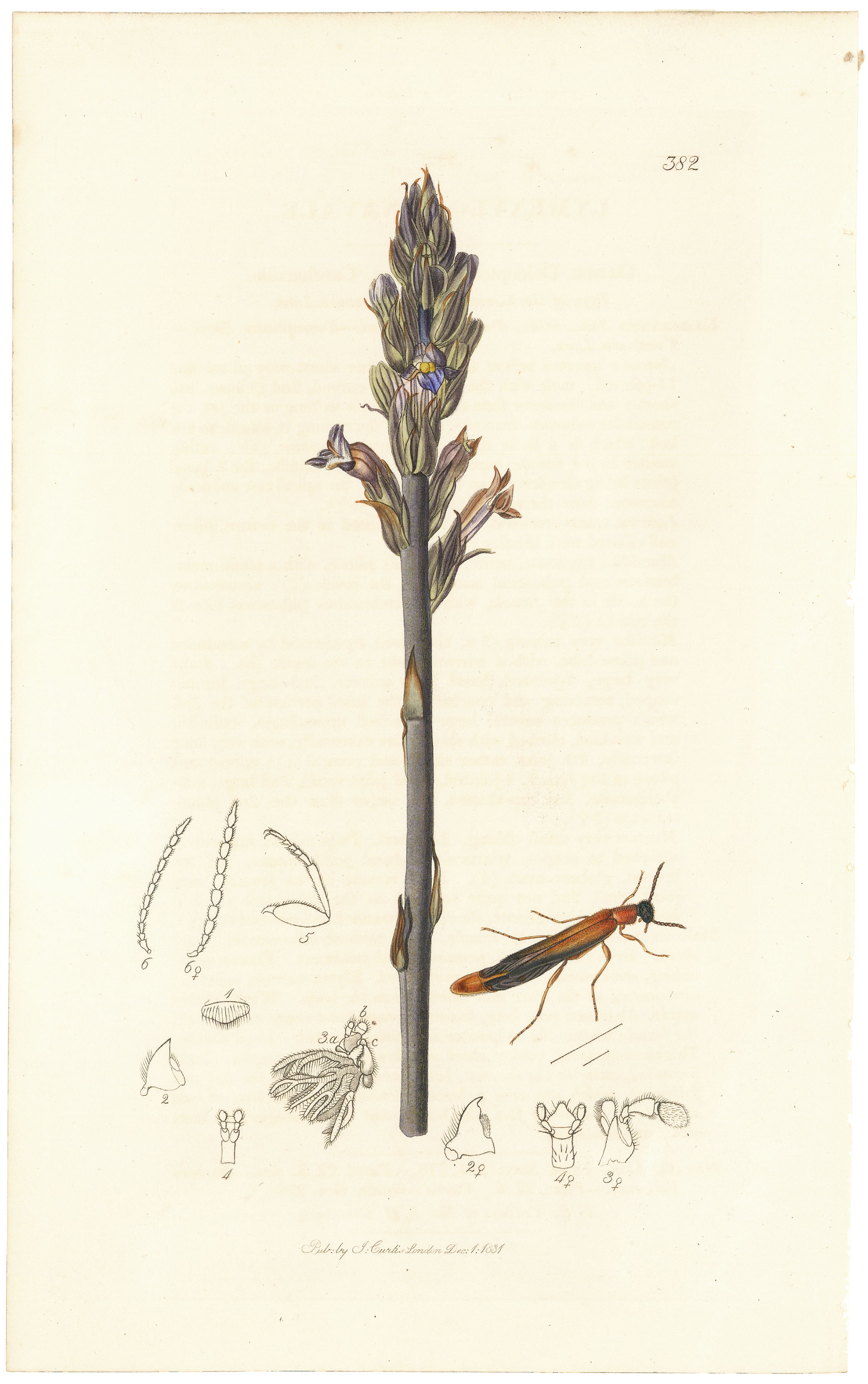 DESCRIPTION: Lymexylon Navale. (Ship-timber Beetle) Plate 382. From British Entomology; Being Illustrations and Descriptions of The Genera of Insects…, published in London between 1824 and 1840 by John Curtis. This hand-colored plate depicts Lymexylon navale, a beetle of the family Lymexylidae, commonly known as the ship-timber beetle. Curtis highlights its elongated body and wood-boring habits, which made it notorious among early naturalists and shipbuilders for damaging oak and other timbers used in construction. His accompanying text notes the insect’s life cycle within wood and its potential impact on maritime and architectural materials. As with many plates in the series, it combines careful entomological observation with artistic detail, preserving a record of an insect both scientifically intriguing and economically significant in 19th-century Britain.