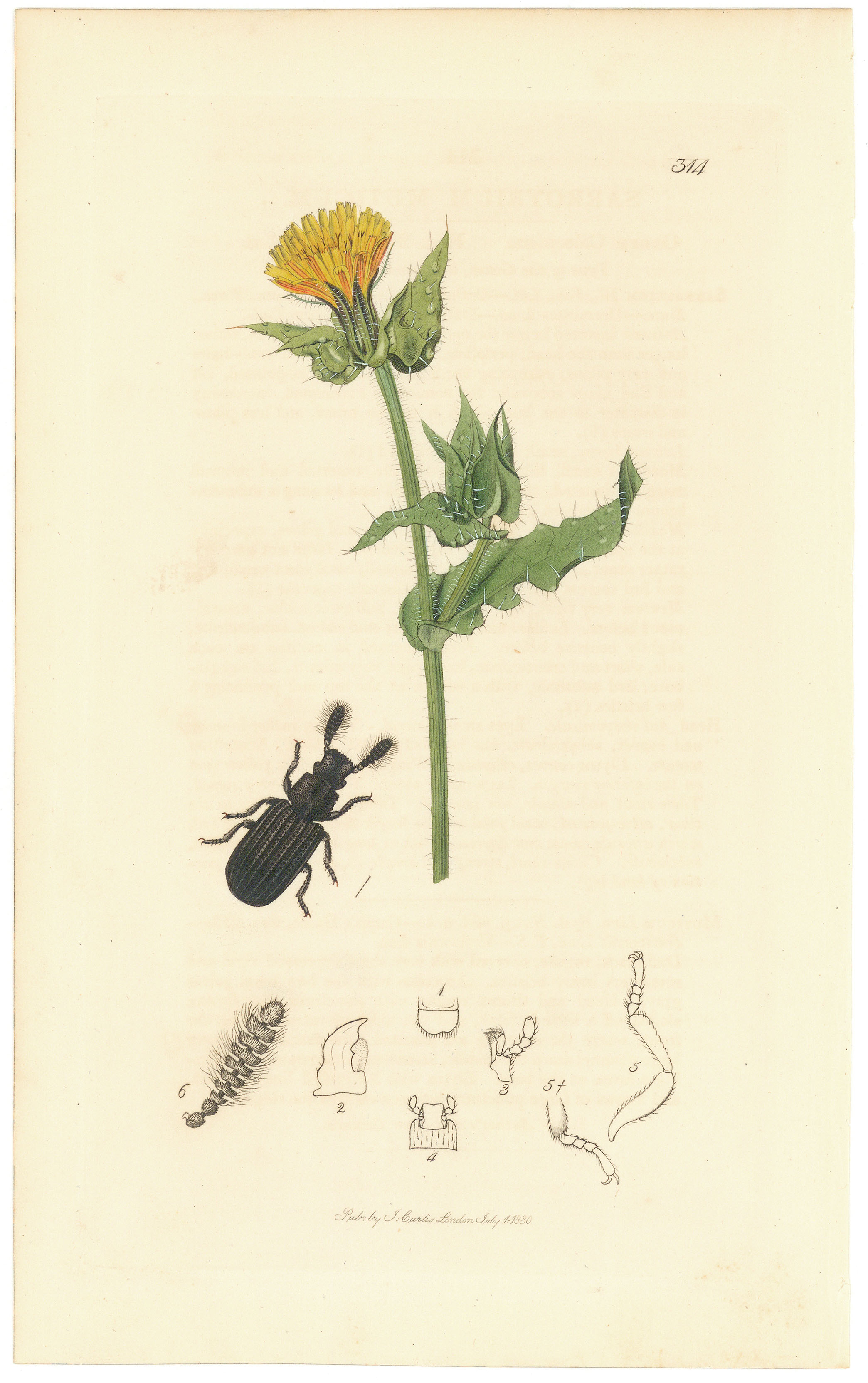 DESCRIPTION: Sarrotrium Muticum. (Bristly Ox-tongue) Plate 344. From British Entomology; Being Illustrations and Descriptions of the Genera of Insects…, published in London between 1824 and 1840 by John Curtis. This hand-colored plate depicts Sarrotrium muticum, more commonly known as the Bristly Ox-tongue, a rough-leaved plant of the daisy family often found along roadsides and waste ground. Curtis included both the illustration and descriptive text, highlighting its coarse, spiny foliage and yellow flower heads that resemble the dandelion. Like the rest of the series, Plate 344 merges scientific accuracy with artistic refinement, documenting not only Britain’s insect life but also the native flora upon which it depended.