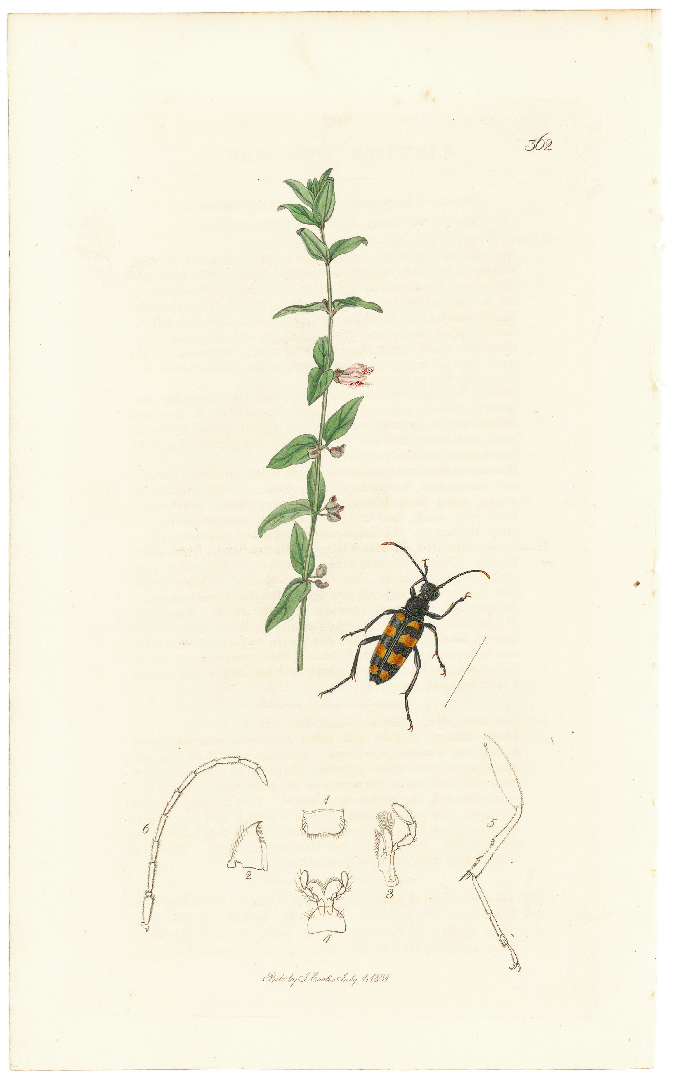 DESCRIPTION: Leptura Apicalis. (Lesser Skull-cap) Plate 362. From British Entomology; Being Illustrations and Descriptions of the Genera of Insects…, published in London between 1824 and 1840 by John Curtis. This finely hand-colored plate depicts Leptura apicalis, a longhorn beetle of the Cerambycidae family, shown together with its associated plant, the Lesser Skull-cap (Scutellaria minor). Curtis’s accompanying text details both the beetle and the plant, emphasizing their relationship within the natural environment. As with all plates in this monumental series, the union of imagery and descriptive notes reflects Curtis’s skill in blending scientific precision with artistic beauty, preserving a vivid record of Britain’s entomological and botanical richness.