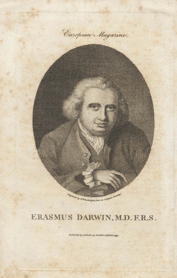 DESCRIPTION: Erasmus Darwin (1731-1802), the grandfather of Charles Darwin, was an accomplished intellectual of the eighteenth century. He was a well-regarded doctor, poet, naturalist, and philosopher. Darwin’s “Zoonomia, or, The Laws of Organic Life” was perhaps the first formal theory of evolution to be published. Darwin recognized many of the same principles his grandson later came to extrapolate on, including those of sexual selection and competition. A progressive thinker, Darwin was also revered for his role in the emergence of the industrial era.