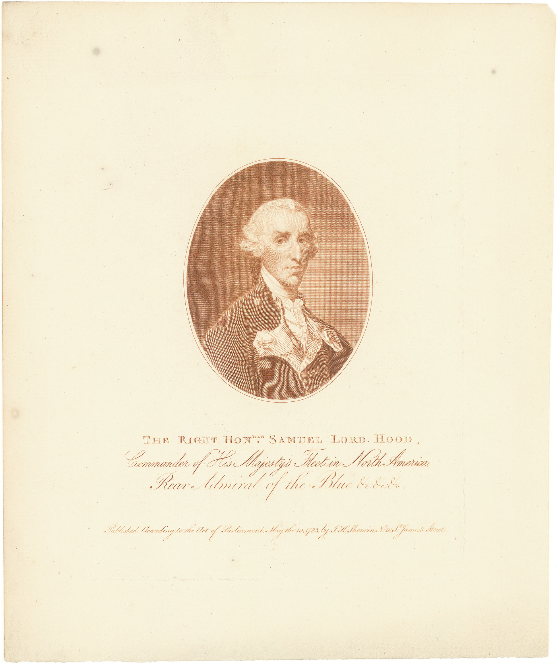 DESCRIPTION: Oval portrait, inscribed "Commander of His Majesty's Fleet in North America. Rear Admiral of the Blue." Samuel Lord Hood (1727-1816) served as a British Admiral in the Navy. He was sent by the crown to serve as a second in command to George Brydges Rodney in the West Indies throughout the duration of the American Revolution. Hood went on to enter Parliament as a representative from Westminster and was appointed vice-admiral. During the French Revolution, Hood was sent to the Mediterranean to serve as Commander in Chief. He served for over a year before returning to England and attaining full Admiral status in 1794. Hood was named governor of Greenwich Hospital, a title which he held until his death in 1816.