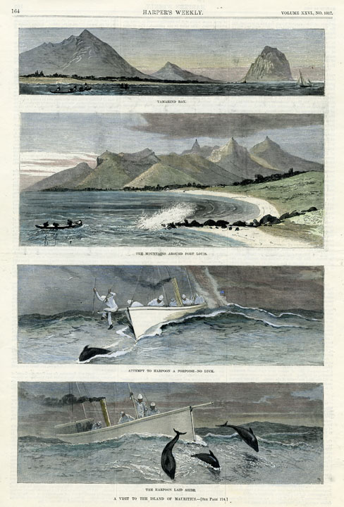 DESCRIPTION: Page 164, Volume XXVI, No. 1317 (full page). Composite of four scenes: Tamarind Bay; The Mountains Around Fort Louis; Attempt to Harpoon a Porpoise - No Luck; The Harpoon Laid Aside.