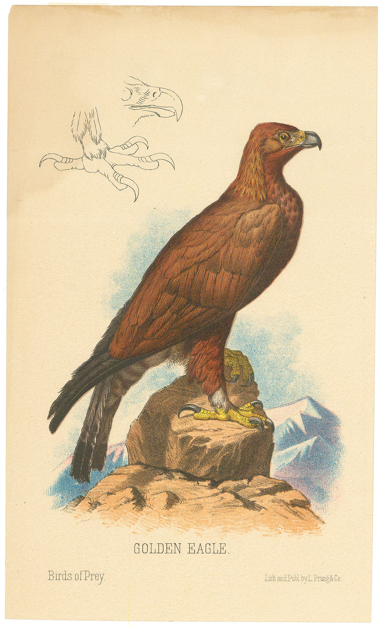 DESCRIPTION: From "Prang's Natural History Series for Children." Volume 1: Birds of Prey. (Vol. 2: Wading Birds; Vol. 3: Scratching Birds; Vol. 4: Swimming Birds]. <br><br> A richly detailed 19th-century chromolithograph of the Golden Eagle (Aquila chrysaetos), produced by the noted American publisher Louis Prang. Known as the “father of the American Christmas card,” Prang was also celebrated for his exceptionally high-quality color prints. This image captures the eagle’s powerful stance and striking plumage, reflecting both artistic skill and scientific accuracy typical of Prang’s natural history series.