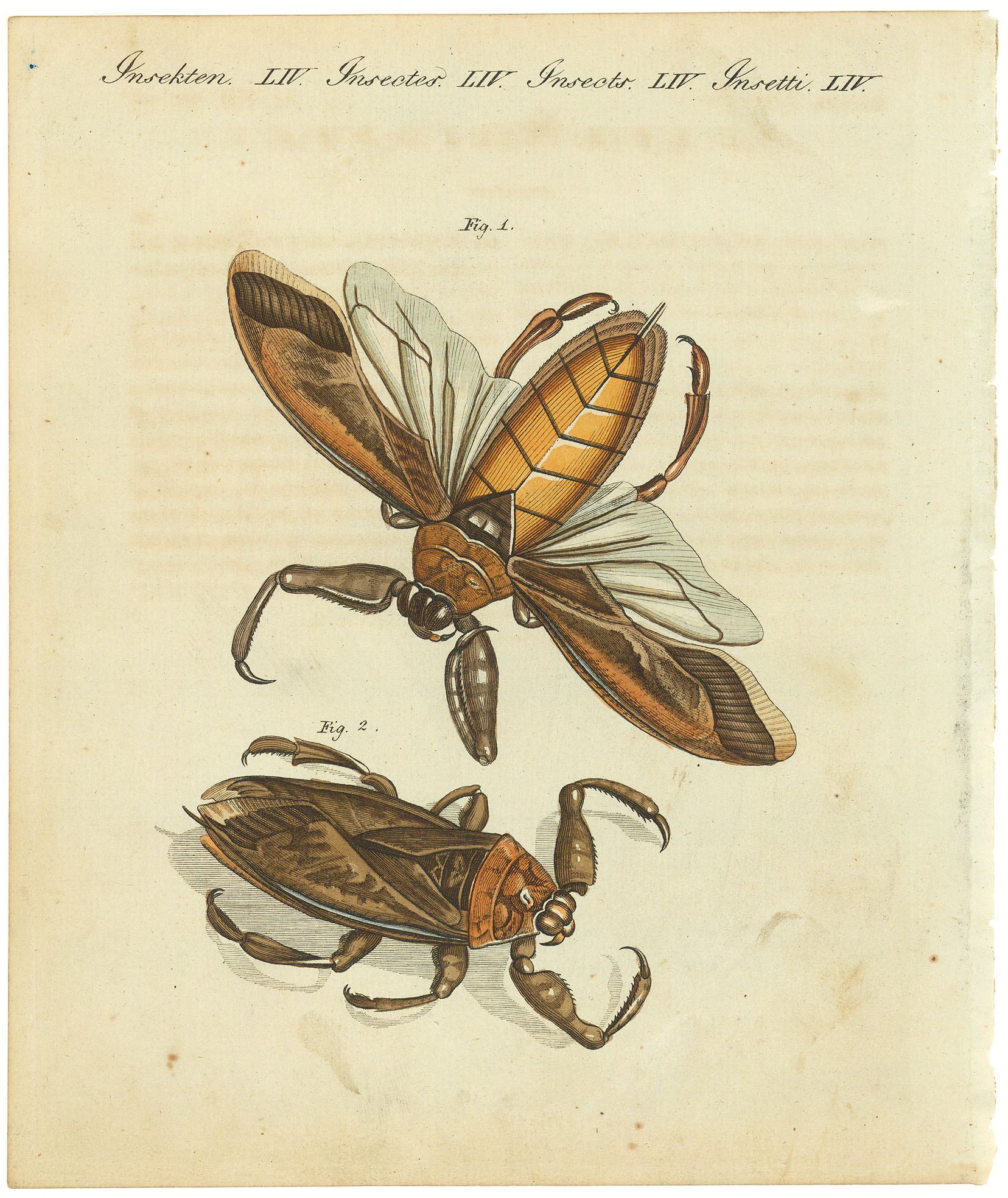 DESCRIPTION: rom F. J. Bertuch’s Bilderbuch für Kinder. This natural history plate depicts the water scorpion (Nepa cinerea), shown both with wings spread and with wings folded. Issued between 1790 and 1830, Bertuch’s Bilderbuch was an elaborate pictorial encyclopedia created to introduce children to the natural and cultural world in all its variety. Plate LIV demonstrates the blending of scientific accuracy and artistic clarity, presenting the insect in multiple views to teach readers about its form and adaptations while maintaining the elegant style characteristic of the series.