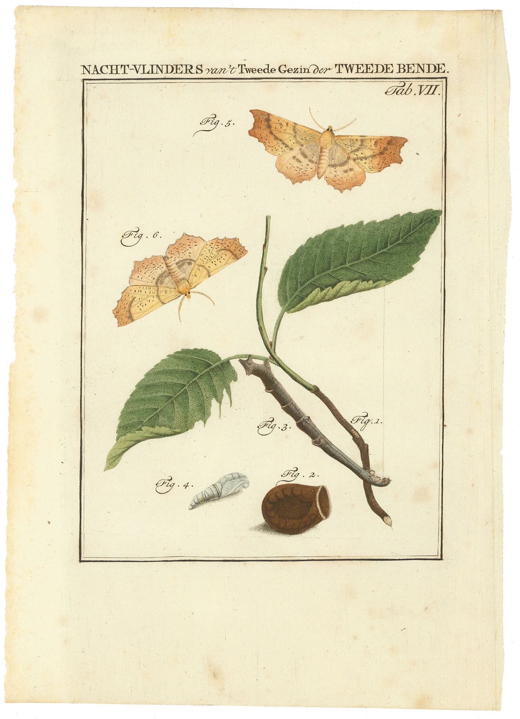 DESCRIPTION: From Beschouwing der Wonderen Gods in de Minstgeachtste Schepselen of Nederlandsche Insecten, by Jan Christiaan Sepp. This finely engraved and hand-colored natural history plate depicts two moths along with accompanying details of leaves, a twig, and other plant elements. Issued in the late 18th century, Sepp’s celebrated work combined precise entomological study with artistic elegance, presenting insects of the Netherlands in rich detail. Tab. VII illustrates nocturnal moths of the “second family of the second order,” arranged to show their markings and natural associations, embodying Sepp’s approach of blending scientific observation with refined composition.