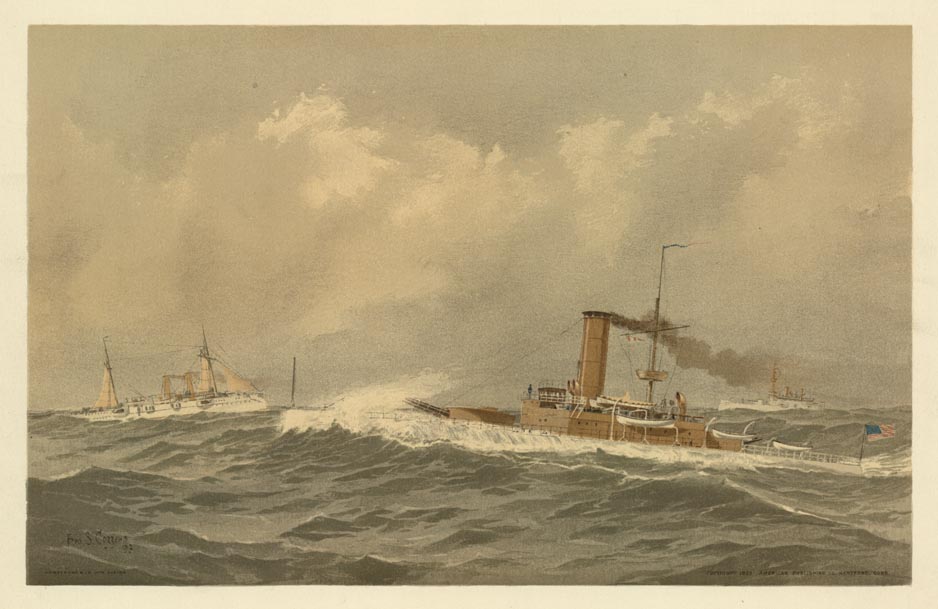 DESCRIPTION: Plate No. 14. From "Old Naval Prints by Fred. S. Cozzens. A Scarce and Unusuall Collection, 24 Prints in Colors - Depicting 75 Ships." "Armstrong & Co. Lith. Boston, Copyright 1893 American Publishing Co. Hartford, Conn."
