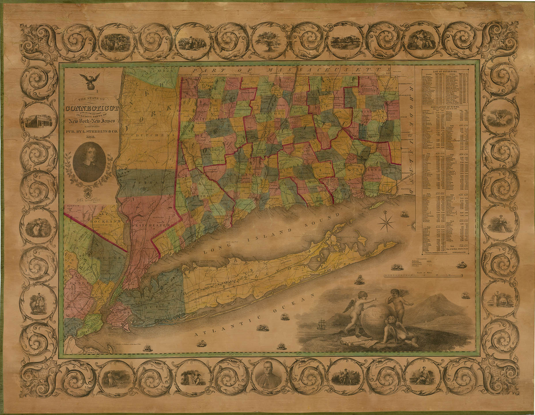 DESCRIPTION: A fine large scale wall map of Connecticut.<br><br> This map shows the state colored by townships with county borders highlighted in red; New York - the whole of Long Island, Staten Island, Manhattan, Westchester County and all the Counties between the Hudson and Connecticut, colored by Counties; New Jersey - the northern counties including Bergen, to Morris County on the west and Monmouth County on the south, colored by counties. A detailed network of railroads - existing and proposed - as well as roads is shown. Large statistical table on the right in the area of Rhode Island with list of Governors and statistical information on population of towns. Below the title is a portrait of John Winthrop. Three inch wide scroll-type decorative border surrounds the map, with 16 vignettes including a portrait of Roger Sherman. In the lower right corner is a vignette illustration showing cherubs inspecting the globe.