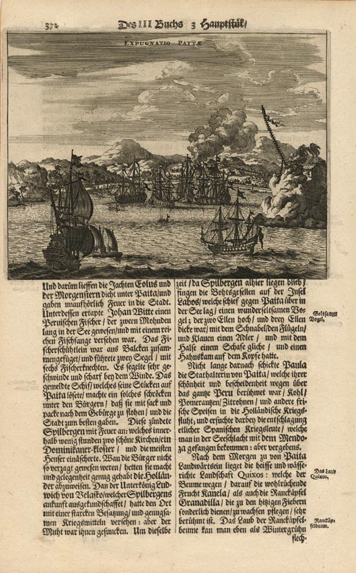 DESCRIPTION: A fine early view of city and harbor and city of Payte, Peru. Appeared in Montanus' "De Nieuwe en Onbekende Weereld: of Beschryving van America".