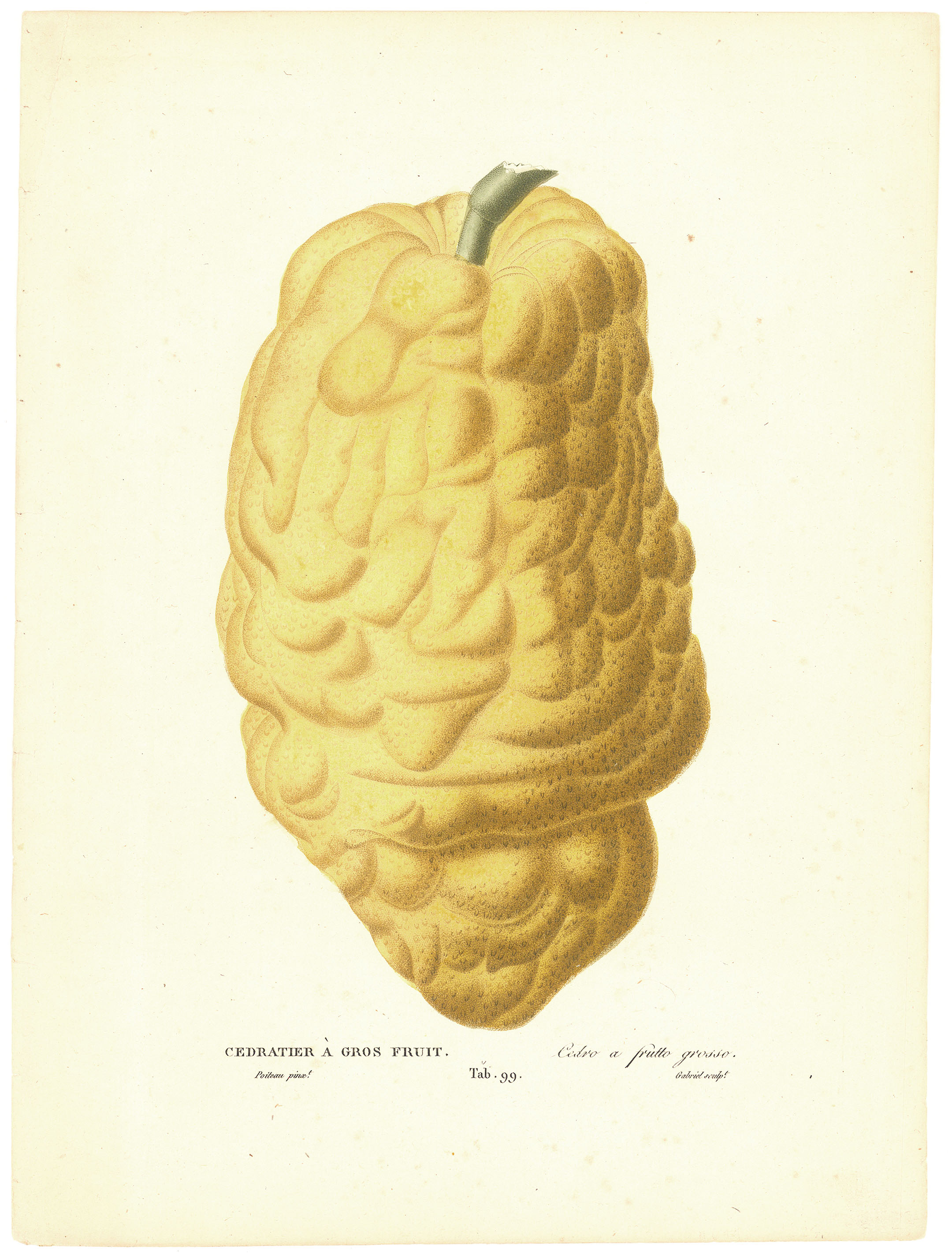 DESCRIPTION: Tab. 99. Poiteau pinxt. Gabriel sculpt. From "Histoire Naturelle des Orangers" by A. Risso and A. Poiteau.<br><br> This beautiful work "contains exquisite drawings of every known variety of orange, lemon and grape fruit, and their congeners, fruits that hang from the leaves, alternately like suns or moons, with every kind of rind, and shaped like gourds or pitchers ... or again, authentic globes of fire, whether pale, as of moonlight, or red-gold like the sun but half-hidden, as in poetry, in its own green shade. A beautiful and inspiring work, in its way not less so than Redoute's Les Liliacees ... or Les Roses" (Sacheverell Sitwell, Great Flower Books)<br><br> Antoine Risso, a French apothecary and botanist, lived and worked in Nice in the south of France. Antoine Poiteau, the illustrator, began his career as an apprentice gardener at the Jardin des Plantes, and spent some time in the Caribbean collecting plants before returning to Paris in 1800 and turning to botanical illustration, with an initial style modelled on Van Spaendonck and Redoute.
