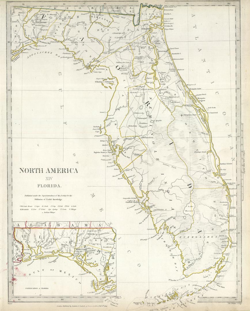DESCRIPTION: A detailed early map of the Florida peninsula, with an inset of the panhandle from Apalachicola Bay west to Perdido Inlet. A few counties are noted. Most of the western peninsula is shown as Seminole Indian lands. The Society for the Diffusion of Useful Knowledge, better known as SDUK, was an English enterprise devoted to spreading the most up to date cartographic information and enhancing geographical understanding and knowledge of the world. Over a period of years, the maps that the SDUK produced were issued by various publishers. The following is a breakdown. Baldwin & Craddock, 1829-32. Chapman & Hall, 1844. C. Knight, 1844-52. G. Cox, 1852-3. Stanford, 1857-70. The maps from this series are known for their fine engraving and attention to detail.