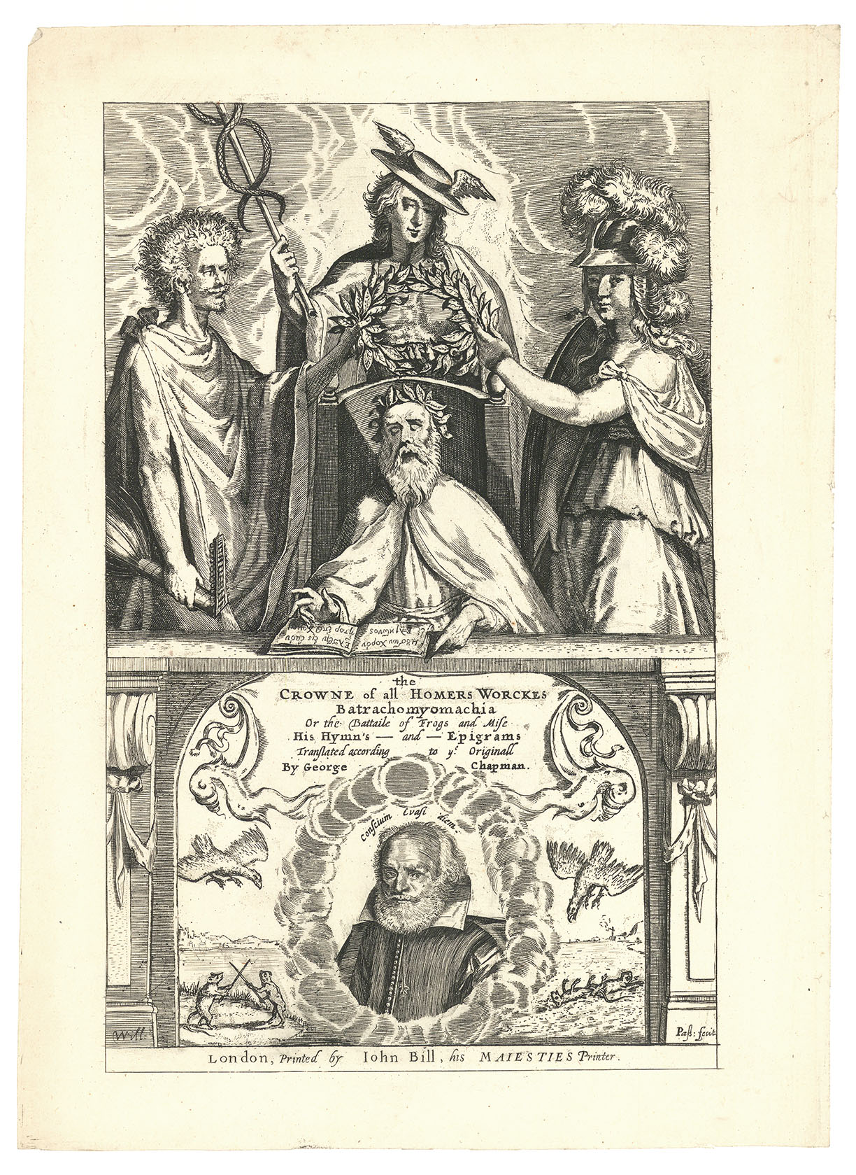 • DESCRIPTION: Engraved by Will Pass (Willem de Passe). George Chapman (1559-1634) was an Englishman who started out as a playwright and then went on to become best known for his translations of Homer's poetry. After translating the Iliad and Odyssey, he did a book of Homeric hymns and the story "Batrachomyomachia." for which this is the title page. Pictured are Homer with a crown of laurel on top; Apollo is holding a musical instrument; Hermes holds his caduceus and Pallas is on the right. Below is a portrait of Chapman with the motto, "Conscium evasi diem." [Ref: The Homeric Hymns and George Chapman's Translation, Intro. by Stephen Scully, Editor's Intro. by Allardyce Nicoll]