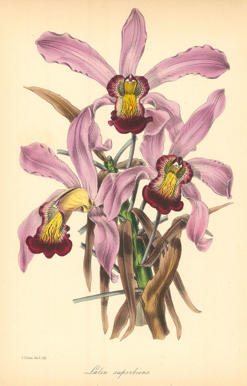 DESCRIPTION: This hand-colored lithograph of Superb Laelia (Laelia superbiens) was drawn and rendered on stone by S. Holden. First published in "Paxton's Magazine of Botany," the artwork highlights the delicate beauty of Superb Laelia with the meticulous detail typical of botanical illustrations from this period. Native to Central America, Laelia superbiens is known for its striking lavender and pink flowers, which are large and showy, making a dramatic statement in any setting. Thriving in warm climates and well-drained soils, it typically blooms in the late fall and early winter. As a member of the Orchidaceae family, Laelia superbiens is highly prized in ornamental gardens and orchid collections for its vibrant colors and elegant form.