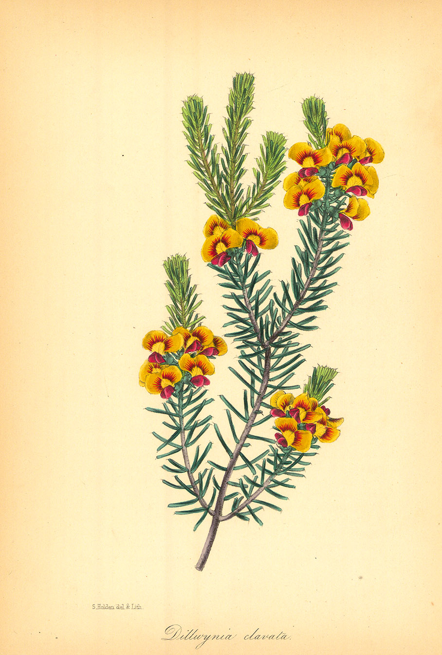 DESCRIPTION: This hand-colored lithograph of Parrot Pea (Dillwynia clavata) was drawn and rendered on stone by S. Holden. First published in "Paxton's Magazine of Botany," volume 7, page 117 (1840), the artwork highlights the delicate beauty of the Parrot Pea with the meticulous detail typical of botanical illustrations from this period. Dillwynia clavata is a native Australian plant known for its striking yellow and red pea-like flowers, which resemble a parrot's beak and give the plant its common name. It typically grows in heathlands and open forests, thriving in well-drained soils. As a member of the Fabaceae family, the Parrot Pea plays a role in supporting local ecosystems by providing nectar for pollinators such as bees. It is also a popular choice for native gardens due to its vibrant colors and hardy nature.