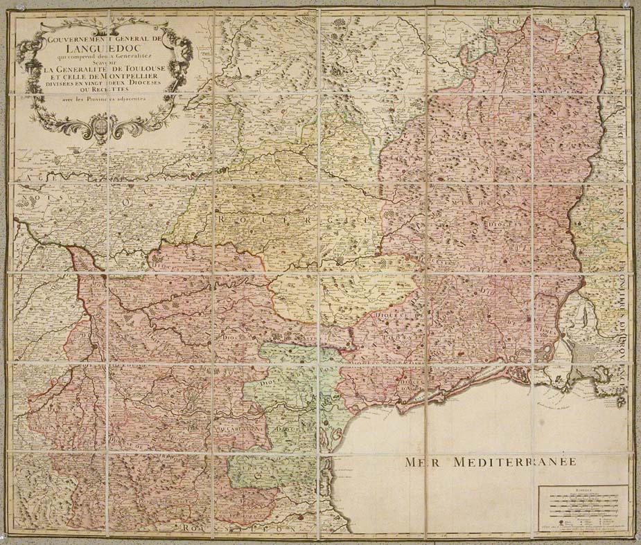 DESCRIPTION: An unusual large scale separately issued segmented, linen backed case map. Lenguedoc is a former province of France and is now part of the modern-day regions of Languedoc-Roussillon and Midi Pyrenees.