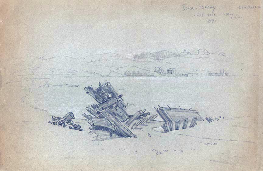 DESCRIPTION: Buildings can be seen over the hilltop. A few painting notations are written in the drawing 'corn,' 'rusty,' etc.