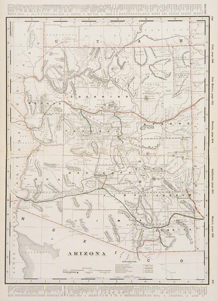 DESCRIPTION: A very detailed map that appeared in "Grant's Bankers' and Brokers' Railroad Atlas." Shows railroads, towns, cities, mountain ranges, rivers and some indian reservations of the time. Railroad lines are color coded.