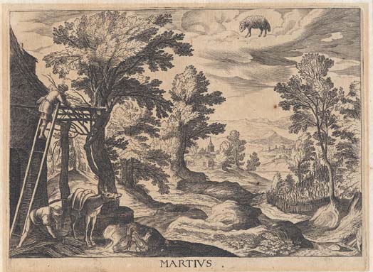 DESCRIPTION: From, Seasons II. Text under image (on January plate first in series) "Antoni tempesta inuentor. EG Sadeler excud:"