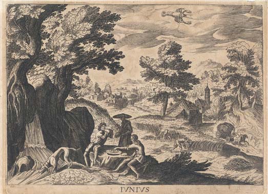 DESCRIPTION: From, Seasons II. Text under image (on January plate first in series) "Antoni tempesta inuentor. EG Sadeler excud:" Cutting spring wheat.