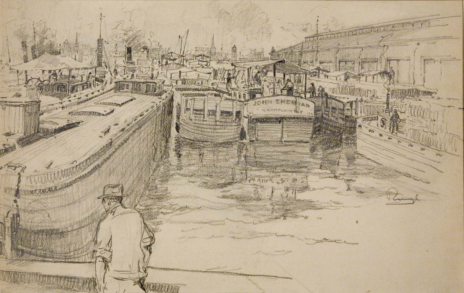 DESCRIPTION: Fun details of different types of boats 'tucked in' along a pier. A tug boat can be seen in the harbor beyond and buildings on the distant shore. One boat is named "John Sher ian, Champlain N.Y."