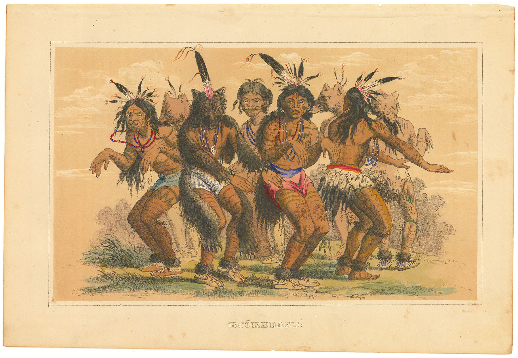 DESCRIPTION: Rare toned lithograph with original hand color after George Catlin. From Nord-Amerikas Indianer, the Swedish abridged edition of Catlin’s Letters and Notes on the Manners, Customs and Condition of the North American Indians. Published Stockholm, 1848. Instead of including the small plates from Catlin’s Letters, this Swedish work adapted scenes from his more dramatic large-portfolio lithographs, which were issued less than five years earlier.