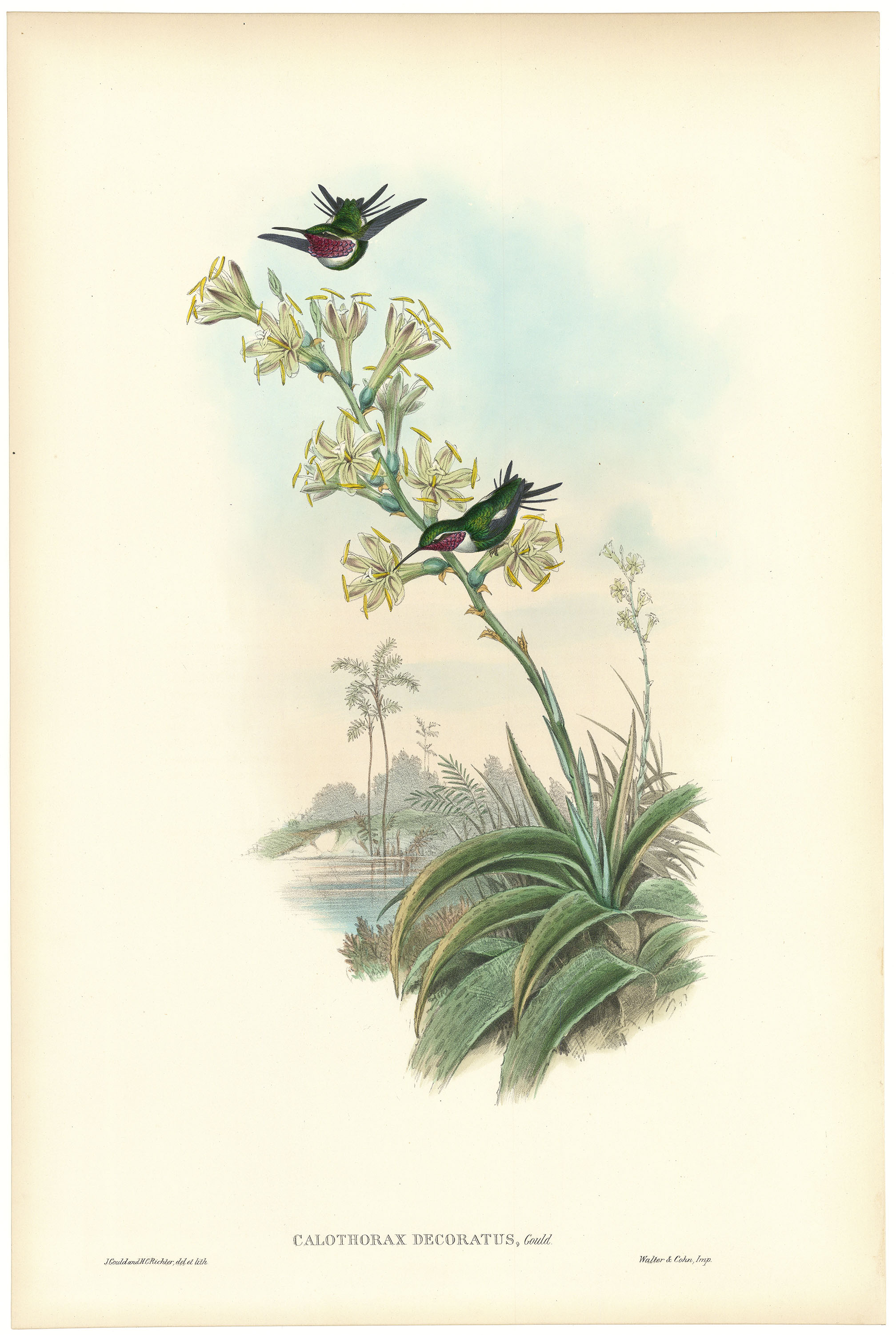 DESCRIPTION: Calothorax decoratus (Beautiful Wood Star). From A Monograph of the Trochilidae, or Family of Humming-Birds, 6 vols., large folio. Published in London, 1849–1887. Printed by Hullmandel and Walter from drawings by J. Gould, H. C. Richter, and William Hart, lithographed by the artists. Gould’s hummingbirds are highly prized for their lavish botanical backgrounds and the iridescent paints often used. British ornithological artist John Gould created the largest and most spectacular body of bird prints in the 19th century. His volumes, containing hundreds of hand-colored lithographs, covered species from the Himalayas to New Guinea. All were issued in large-folio format, enabling Gould to show each bird’s appearance in detail, usually in its natural habitat. From 1832 to 1881 Gould travelled the world seeking new specimens, often writing the scientific texts himself. He oversaw every phase of his operation, from securing and drawing specimens to soliciting subscriptions. Other artists who assisted him had substantial reputations of their own, including his wife Elizabeth Gould, Edward Lear, Henry C. Richter, Josef Wolf, and William Hart.