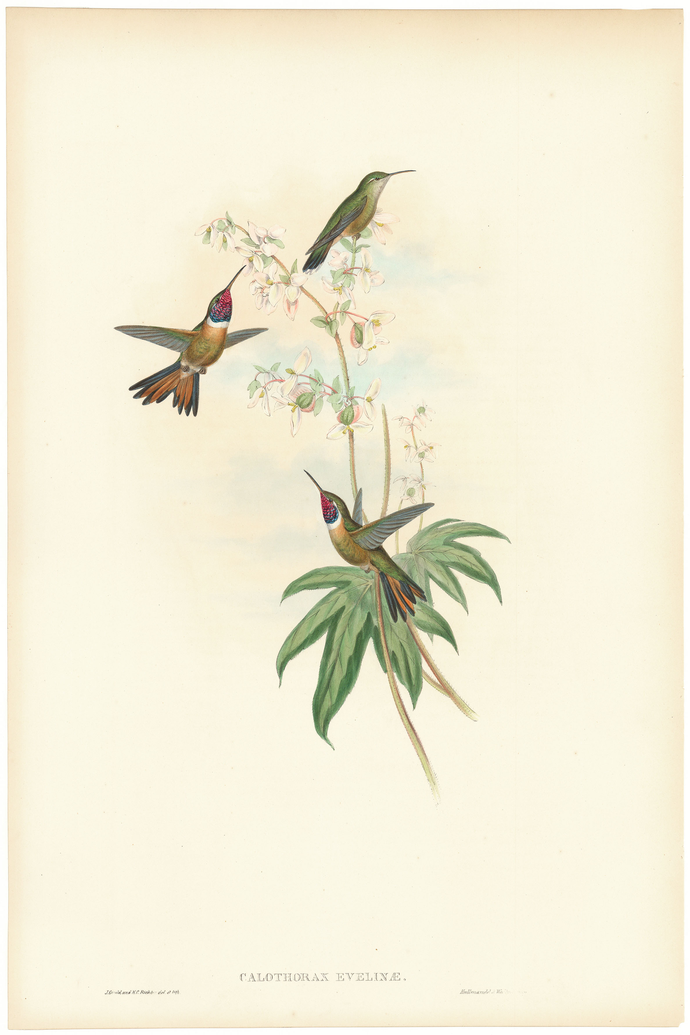 DESCRIPTION: Calothorax evelinae (Evelina’s Wood Star). From A Monograph of the Trochilidae, or Family of Humming-Birds, 6 vols., large folio. Published in London, 1849–1887. Printed by Hullmandel and Walter from drawings by J. Gould, H. C. Richter, and William Hart, lithographed by the artists. Gould’s hummingbirds are highly prized for their lavish botanical backgrounds and the iridescent paints often used. British ornithological artist John Gould created the largest and most spectacular body of bird prints in the 19th century. His volumes, containing hundreds of hand-colored lithographs, covered species from the Himalayas to New Guinea. All were issued in large-folio format, enabling Gould to show each bird’s appearance in detail, usually in its natural habitat. From 1832 to 1881 Gould travelled the world seeking new specimens, often writing the scientific texts himself. He oversaw every phase of his operation, from securing and drawing specimens to soliciting subscriptions. Other artists who assisted him had substantial reputations of their own, including his wife Elizabeth Gould, Edward Lear, Henry C. Richter, Josef Wolf, and William Hart.