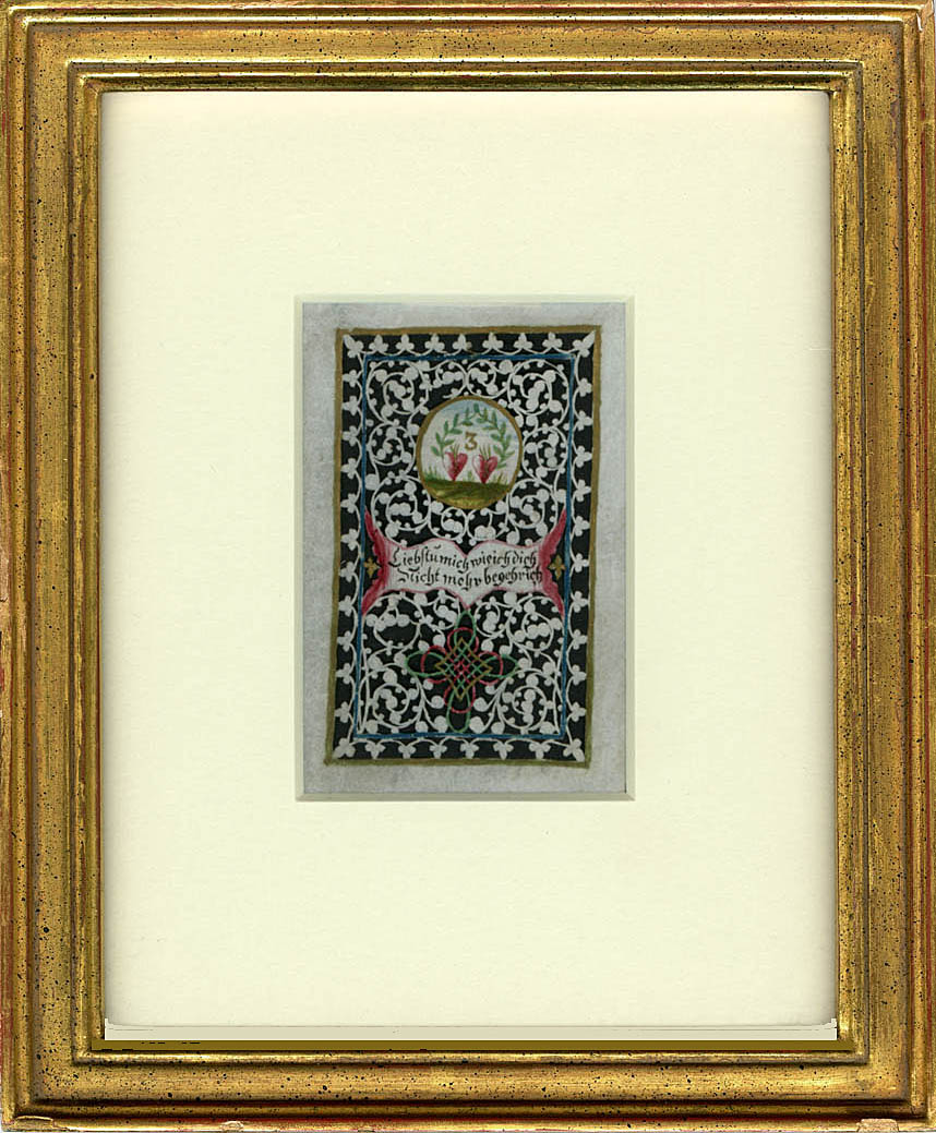 DESCRIPTION: "...thought to have been made by nuns in Strasbourg." - Ruth Webb Lee "A History of Valentines." Two painted hearts entwined with leaves. The number 3 is painted in gold above and within the hearts. An Endless Knot, painted in red and green, is just under the handwritten note."