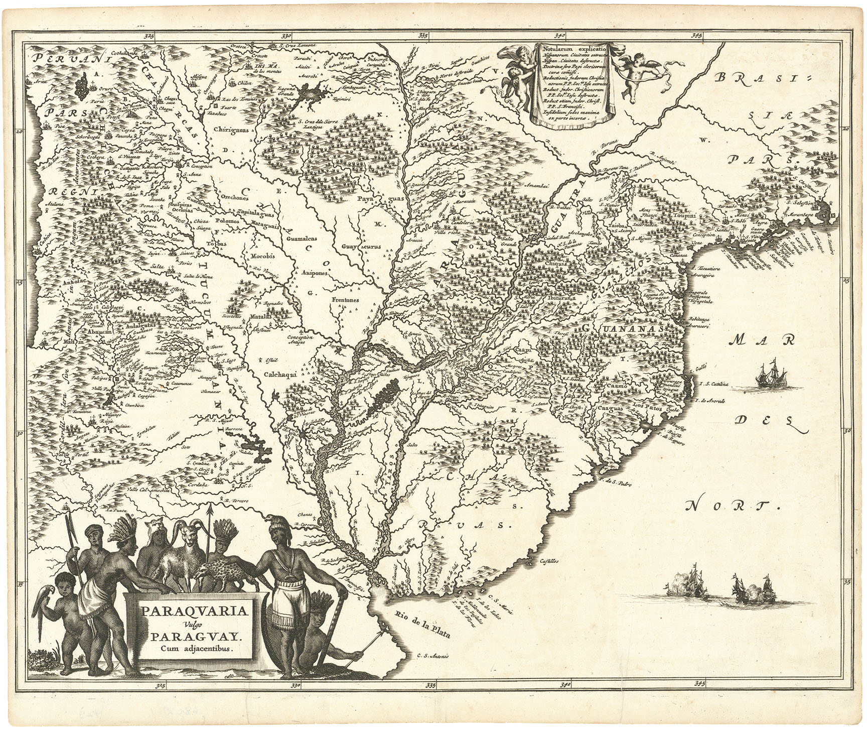 DESCRIPTION: A fine map of Paraguay from Montanus' "De Nieuwe en Onbekende Weereld: of Beschryving van America." This map is based on Blaeu’s map of the same title, and extends from Rio de Janiero to the Rio de la Plata basin. The map includes Uruguay, Paraguay, part of northern Argentina, and northern Chili. It is highly detailed with a wealth of topographical detail and an ornate cartouche.