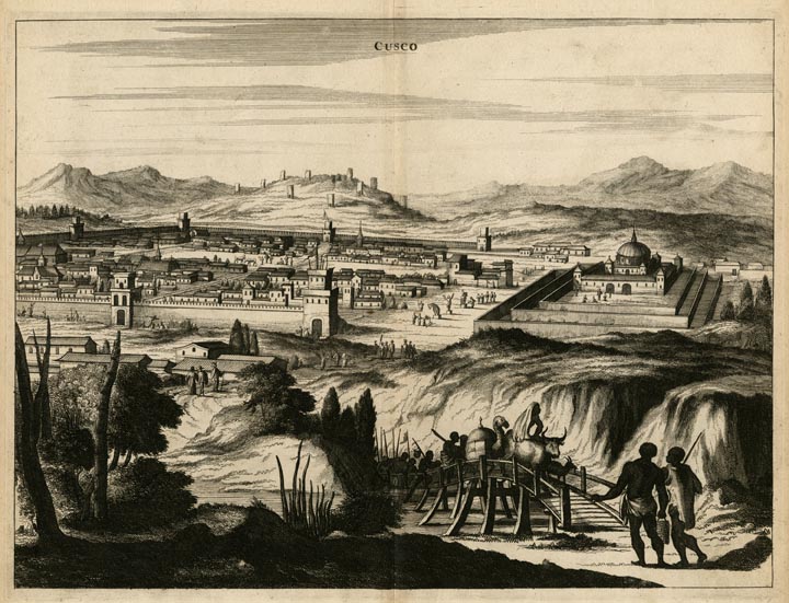 DESCRIPTION: A fine aerial view of Cuzco, Peru. Ffrom Montanus' "De Nieuwe en Onbekende Weereld: of Beschryving van America." It depicts the early layout of the modern city of Cuzco, which was rebuilt by the Spanish when they invaded Peru. Cuzco was built on the site of an ancient Incan city of the same name, which was the capitol of the Inca Empire. The ruins of the old town are scattered along the hillside in the background. The church of Santo Domingo to the right of the town stands on the base of the old Incan Sun Temple.