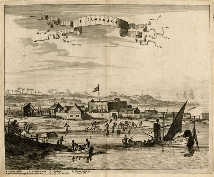 DESCRIPTION: A fine view of the Dutch Forte Oranje on the island of Itamaraca in Brazil. From Montanus' "De Nieuwe en Onbekende Weereld: of Beschryving van America." Itamaraca was one of the first parts of Brazil to be settled by the Portuguese, and produced some the richest sugar plantations in the state of Pernambuco. Like Olinda, it was captured by the Dutch, who built an impressive fort as a safeguard against future attack.
